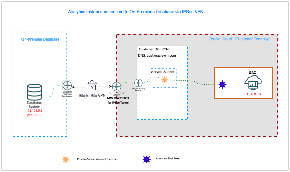 The following diagram shows an Analytics Instance connected to an on-premises database.